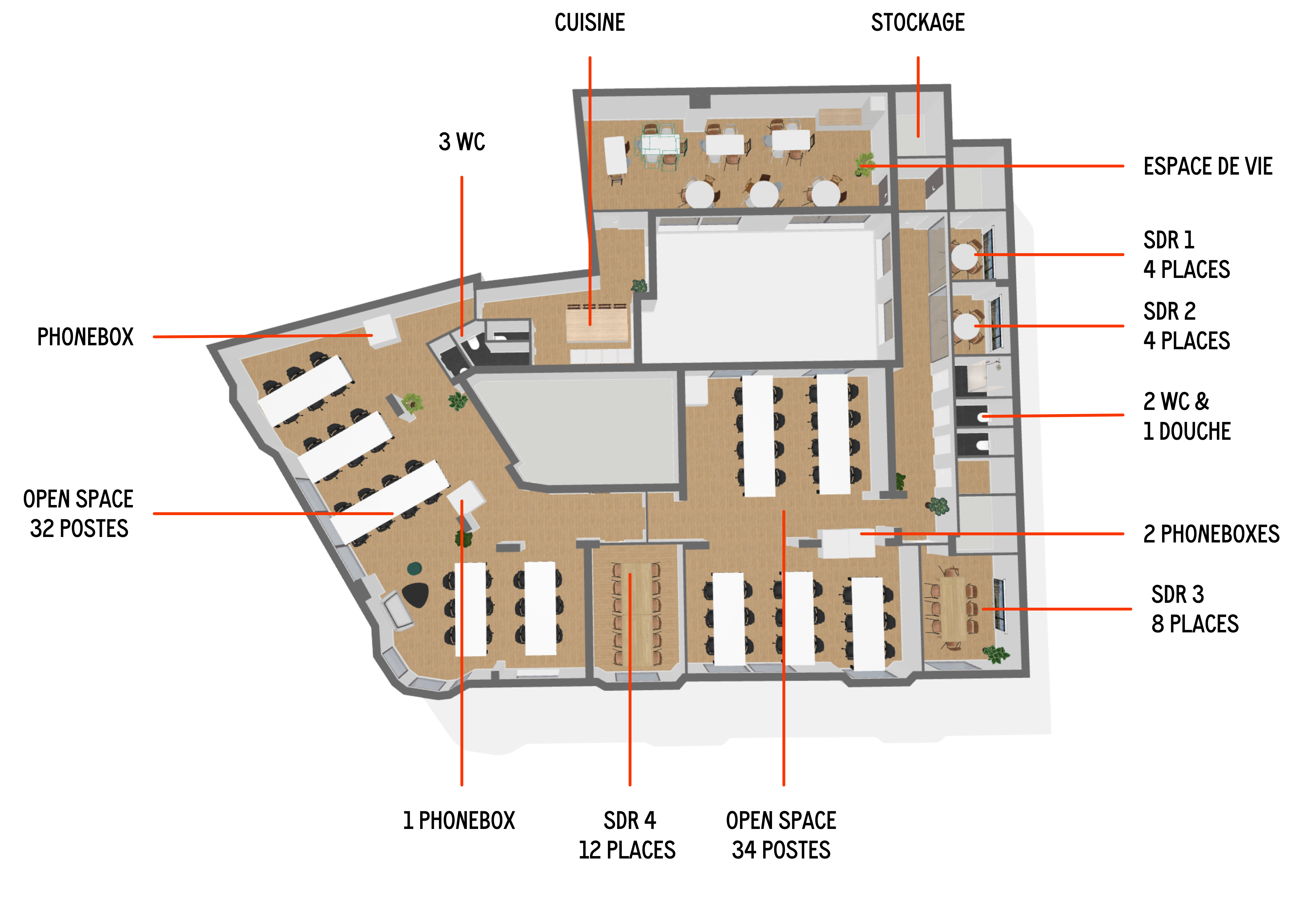 Conçu pour accueillir 66 postes de travail, il dispose également de 4 salles de réunion, 4 phoneboxes, ainsi qu’un système hi-fi Devialet pour une ambiance sonore optimale.
