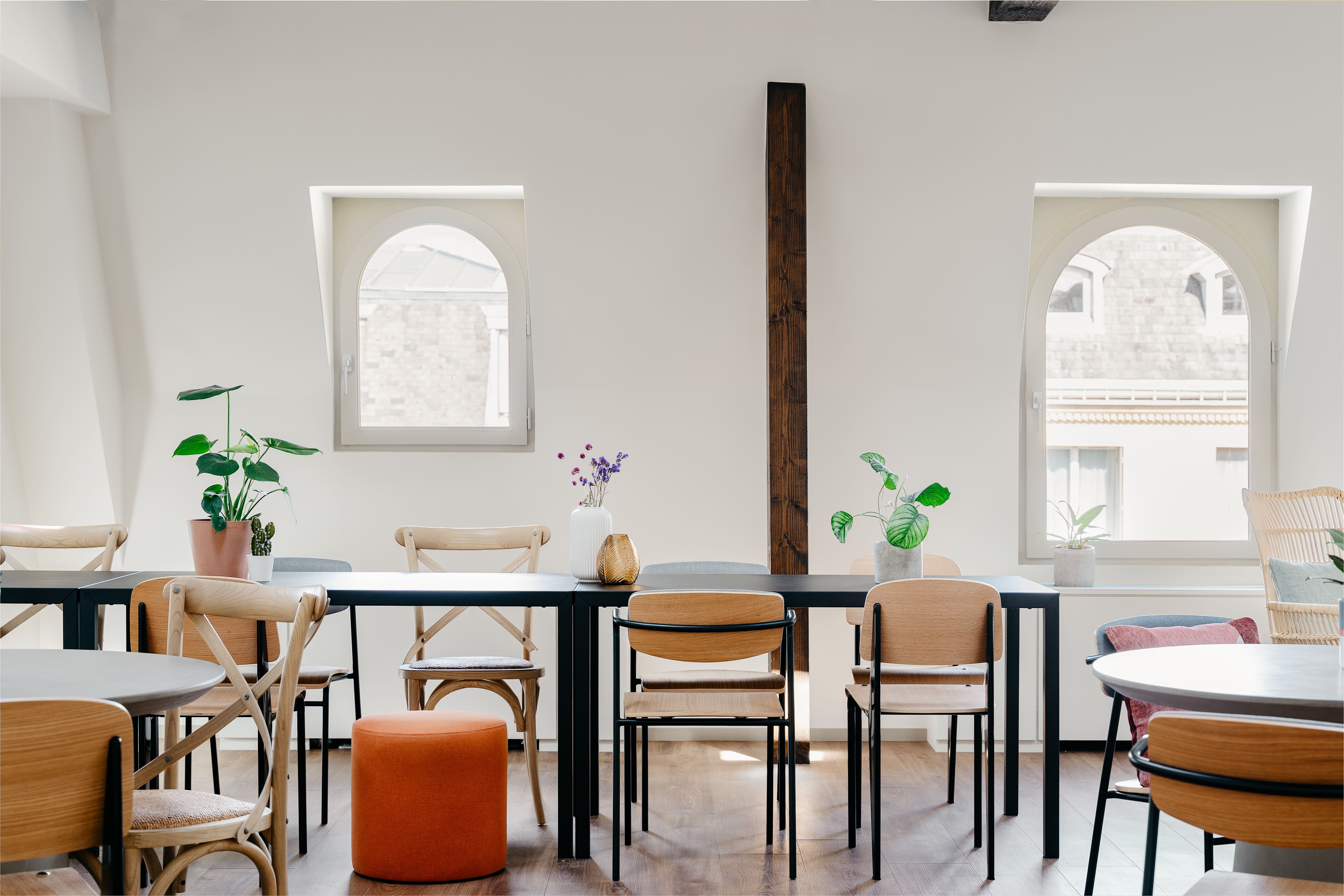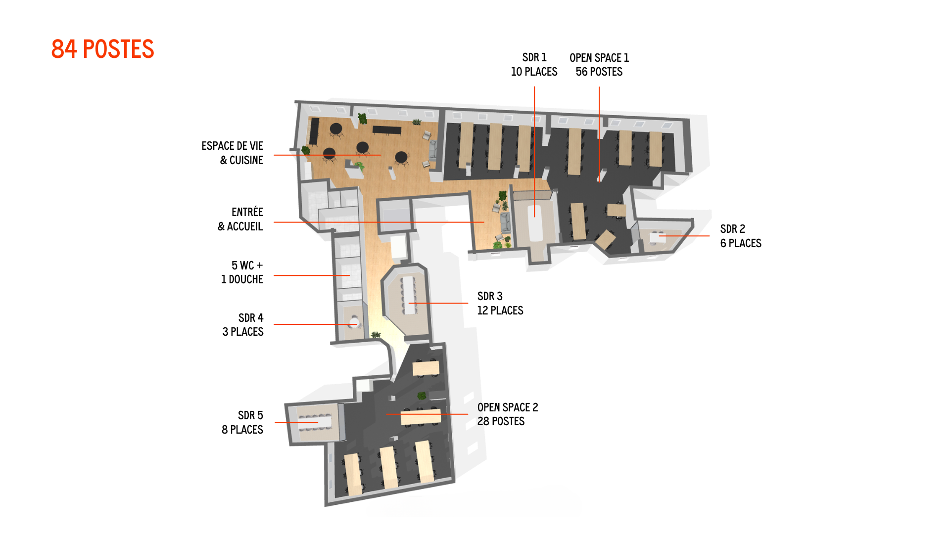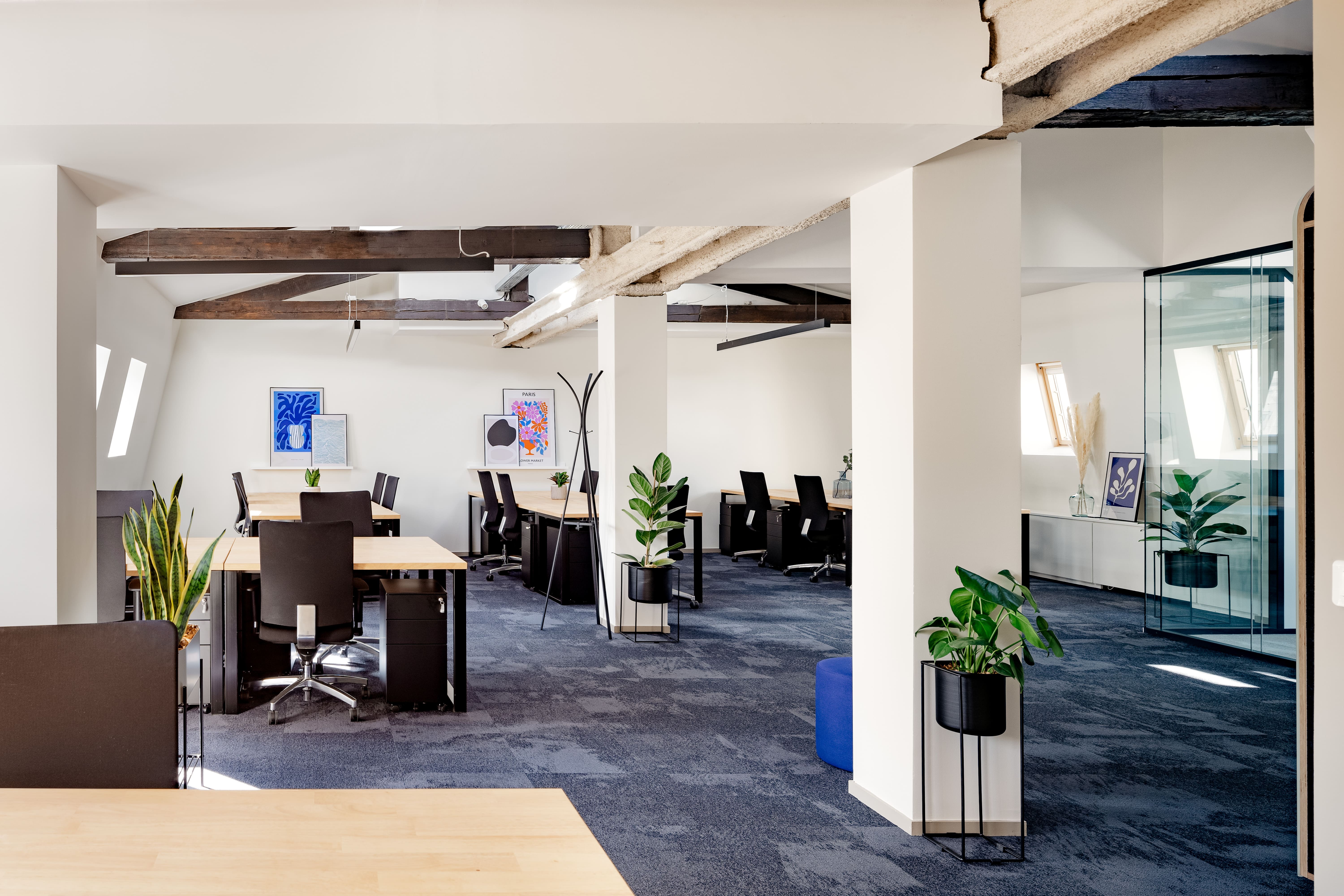 Espace plein de charme avec poutres apparentes. Idéal pour 79 postes ou 84 postes. Possible de densifier jusqu'à 90 postes.