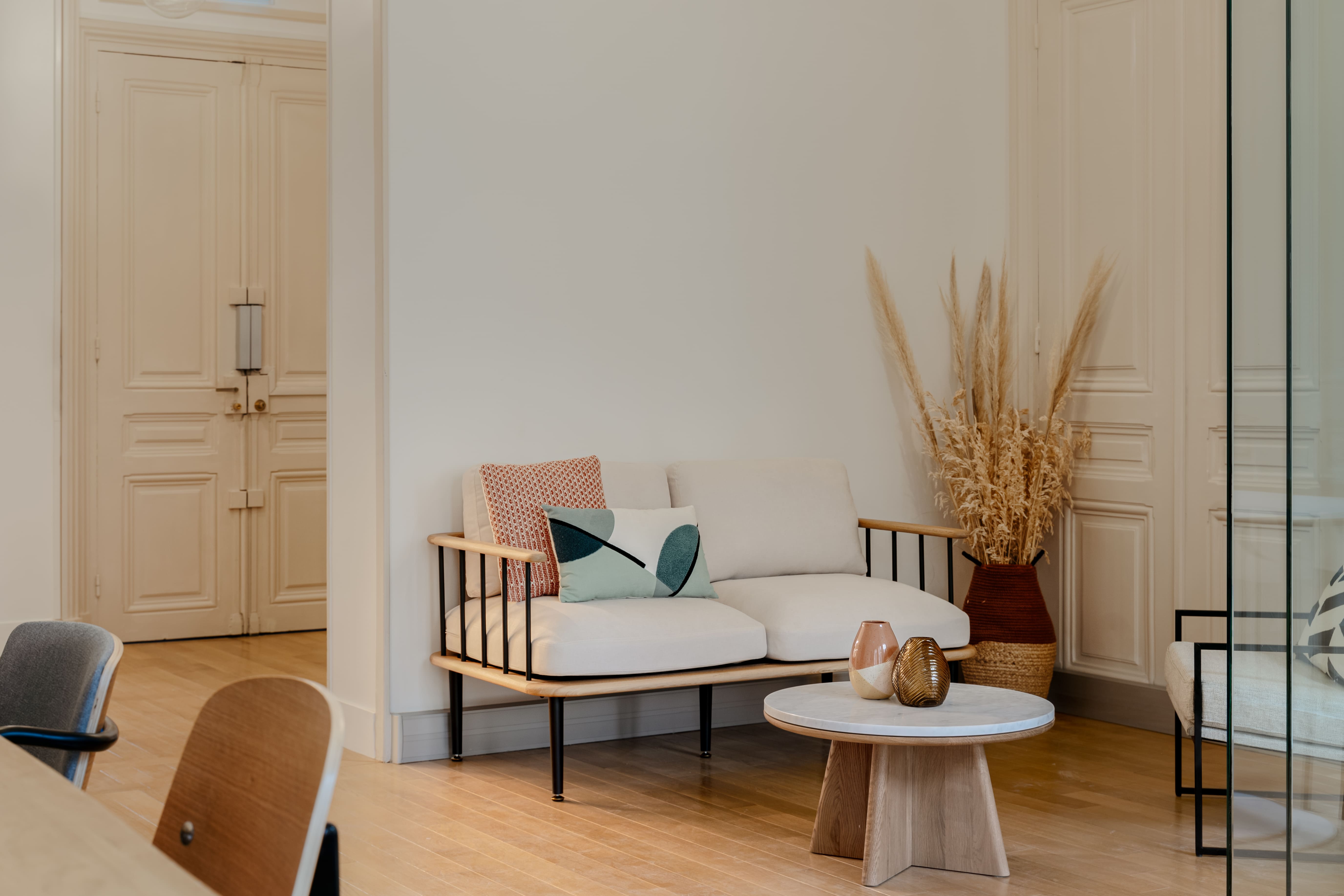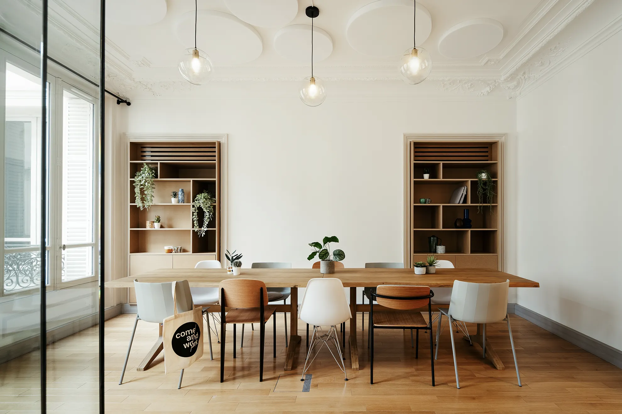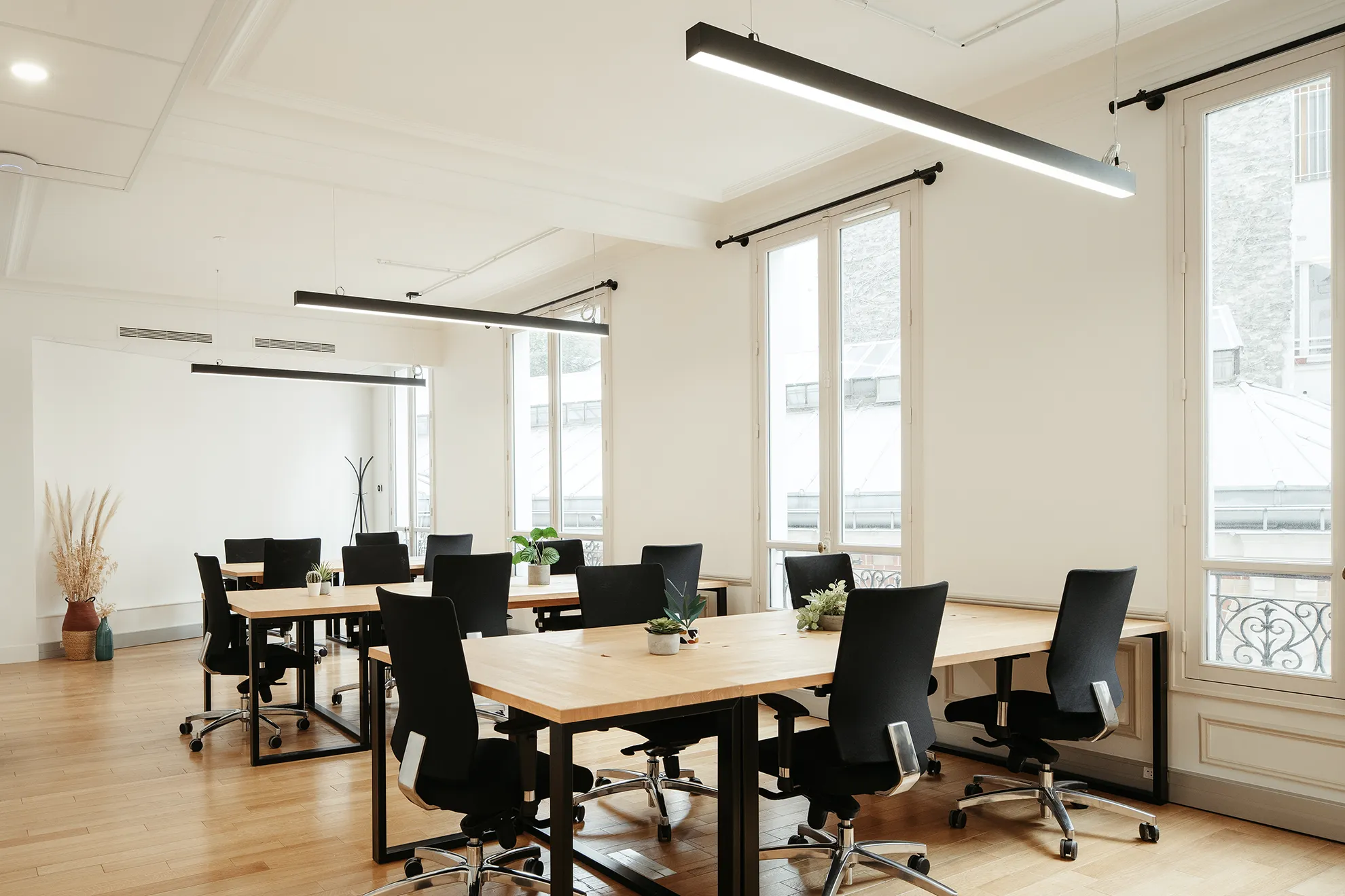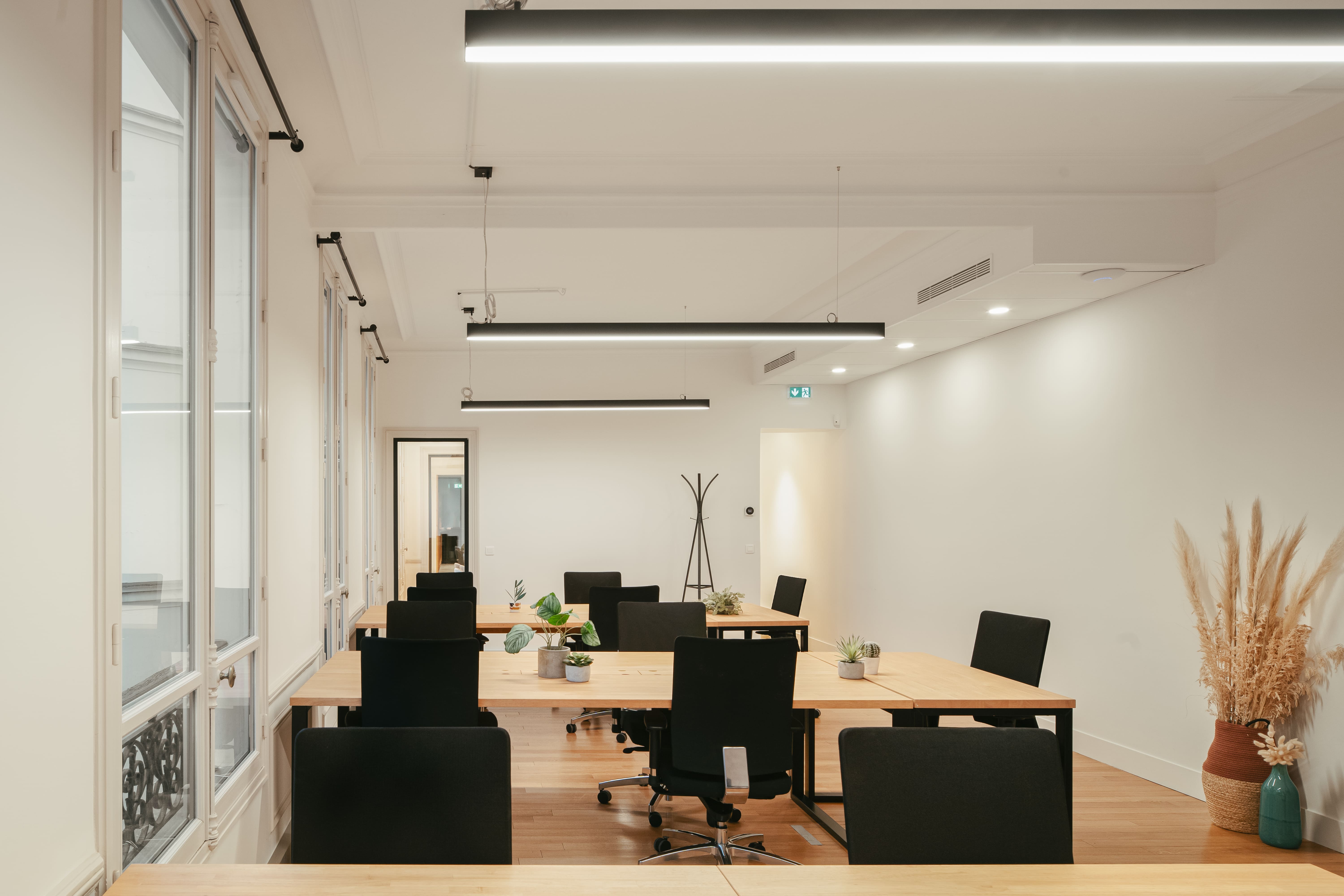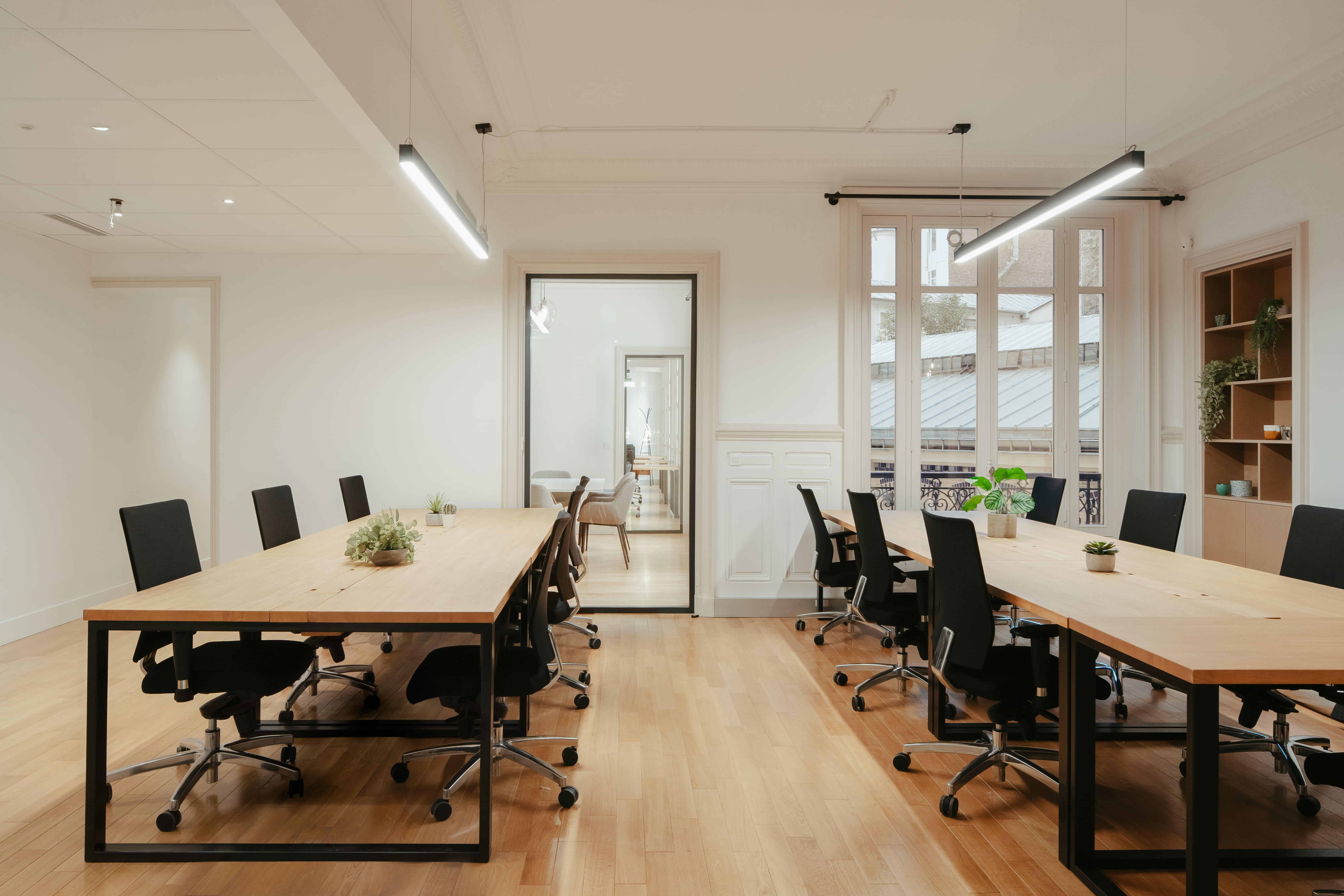 Au 2e étage, vous trouverez notre espace jusqu’à 29 postes, très calme et avec beaucoup de cachet : parquet massif et moulures au plafond.