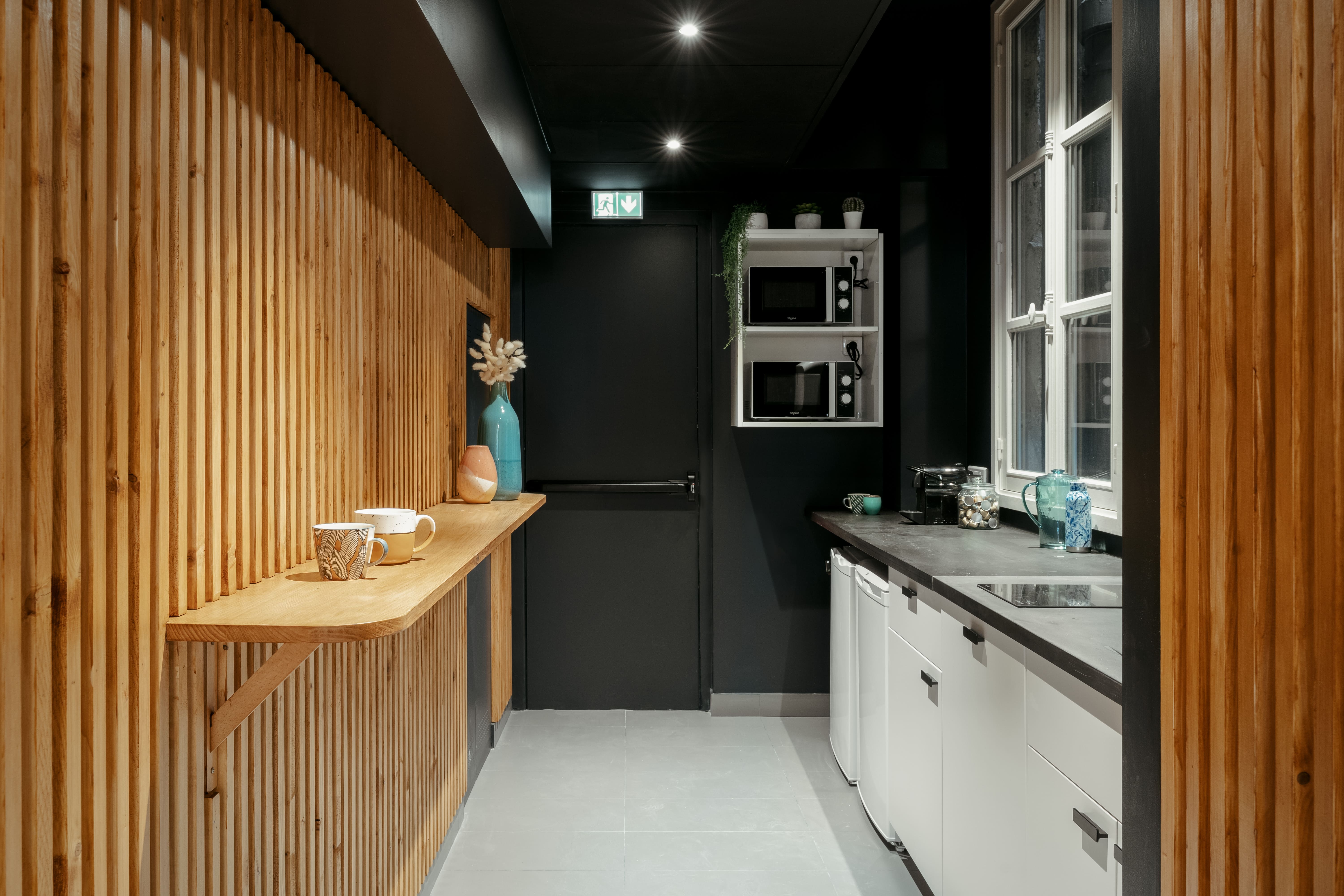 Cet espace compte 2 open spaces entourés de hautes fenêtres, 2 salles de réunion, une cuisine et un confortable espace détente.