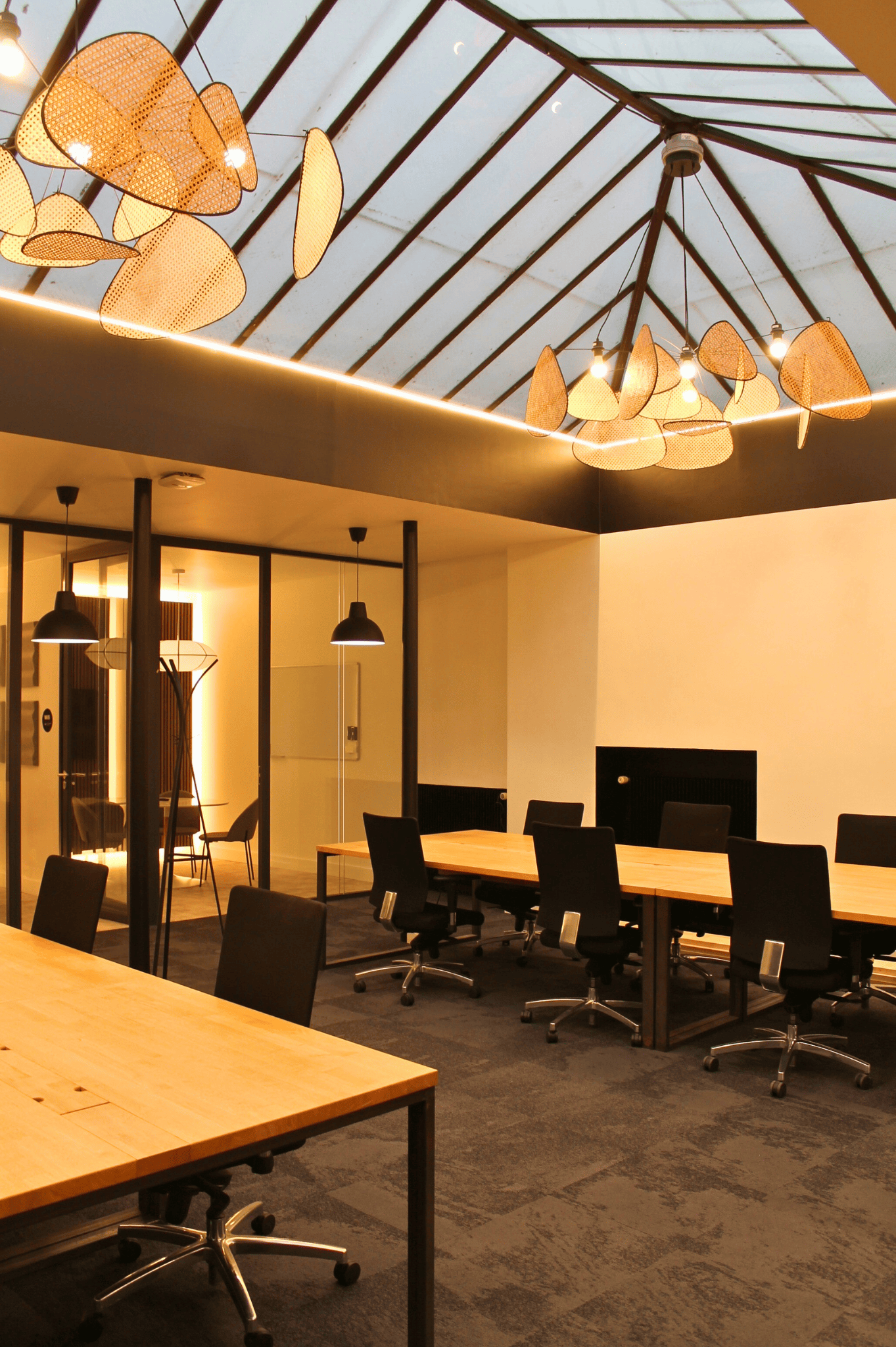 Deux grandes verrières abritent les espaces de travail et donnent tout le cachet atypique industriel des bureaux.